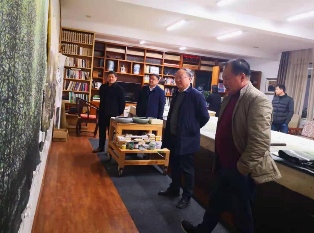 公司党委书记谢红星教授(右二)看望创作中的公司名誉经理董继宁教授(右一)