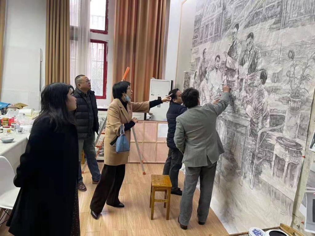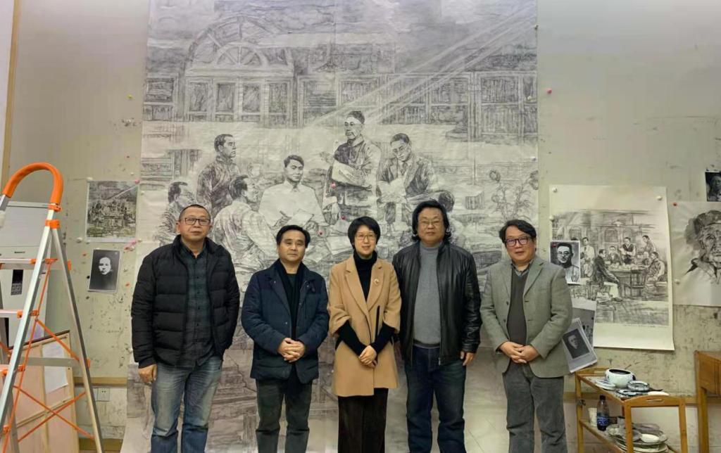 2月26日上午,湖北省委宣传部文艺处副处长张娜同志来艺术公司看望正在进行庆祝建党100周年中央宣传部重大题材创作的谭崇正教授和合作画家,张处长首先对4位画家进行了节日慰问。对画家们放弃春节休息,争分夺秒的抓进度,六易其稿,严谨求实,精益求精的创作态度给予了高度赞扬。她说,今年是我党建党100年华诞,用宏篇巨制的美术作品来讴歌党的光辉历程,颂扬党领导中国人民站起来、富起来、强起来的伟大成就,体现了艺术家的责任与担当,向同志们表示感谢!公司谭崇正教授向张处长详细汇报了此次创作的《曙光---武汉共产党早期组织诞生》的构思与创作特点。张处长就画面细节给予了具体指导。艺术公司经理许开强教授、副经理尹朝阳教授参加了慰问观摩。