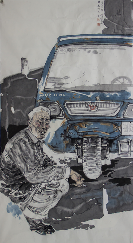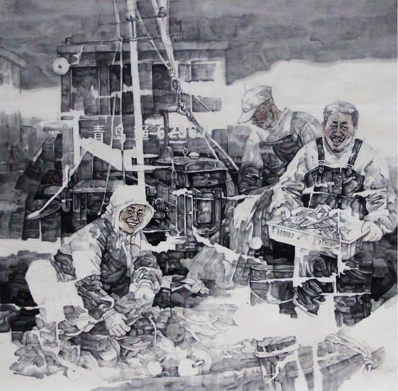 张春海的国画作品《渔歌》以家乡青岛发达的海产业为背景,是对家乡生活的写照。张春海三岁随父母到青岛,在海边长大,渔民忙碌的身影会让他回忆起儿时与父亲一起去海边忙活。来到武汉学习,家乡情结也是他一直想要尝试的创作主题。张春海对画中的人物形象和神态下了一番功夫,他不想随便一画,不仅要让他们是渔民,而且要是憨厚欢乐的青岛渔民形象。由此为主体再去营造画面的氛围,柴油机渔船作背景就极好。这样贯穿下来便产生了这幅作品,定位仍是家长情结,用结实的造型表现渔民的生活状态和精神面貌以及家乡的环境。