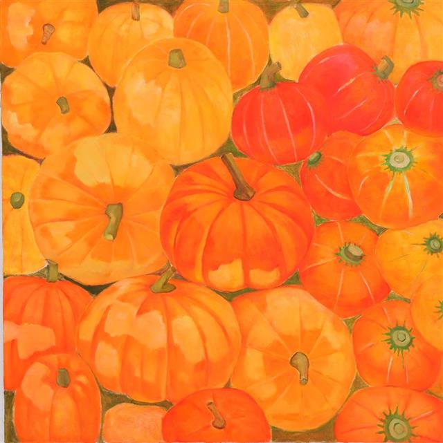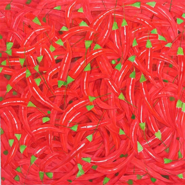 南瓜、辣椒、西红杮……现场的多幅蔬果主题作品,以饱满的果实、鲜艳的色彩,让观众情不自禁地受到感染,感受到生命的热情和收获的喜悦。李碧红介绍,去年疫情之后,她去了菜场,感受着温暖浓郁的烟火气息,蔬菜与水果散发出了以往她不曾注意的魅力。《果实系列》以局部代替整体,表现丰收的情景和富足的状态,讴歌国家的强盛与人民的幸福。