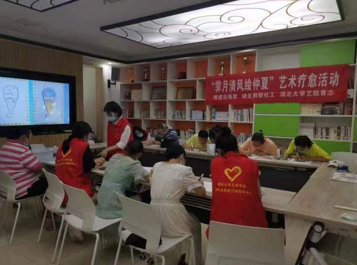 当天活动的主题是“霁月清风绘仲夏”。志愿者们首先通过“色彩情感”小活动进行暖场。接着,志愿者们带领“阳光学员”将他们对夏日的感受用色彩表达出来,而不强调绘画技术,这种通过艺术的创造性过程有利于改善参与者的生理、心理状态。在学员们的笔下,冰淇淋小兔子、清爽西瓜等跃然纸上。随后,志愿者们将学员们今年上半年创作的画作进行展示。面对自己创作的一幅幅作品,有些学员还有些害羞,多数学员还是主动地表达感情。由于武汉夏季炎热,志愿者们还细致耐心地给学员们介绍了一些防暑降温的知识。活动最后,湖大艺术公司团委书记许诩给学员们送上了自己创作的书法作品,祝福每一位学员暑期健康快乐。