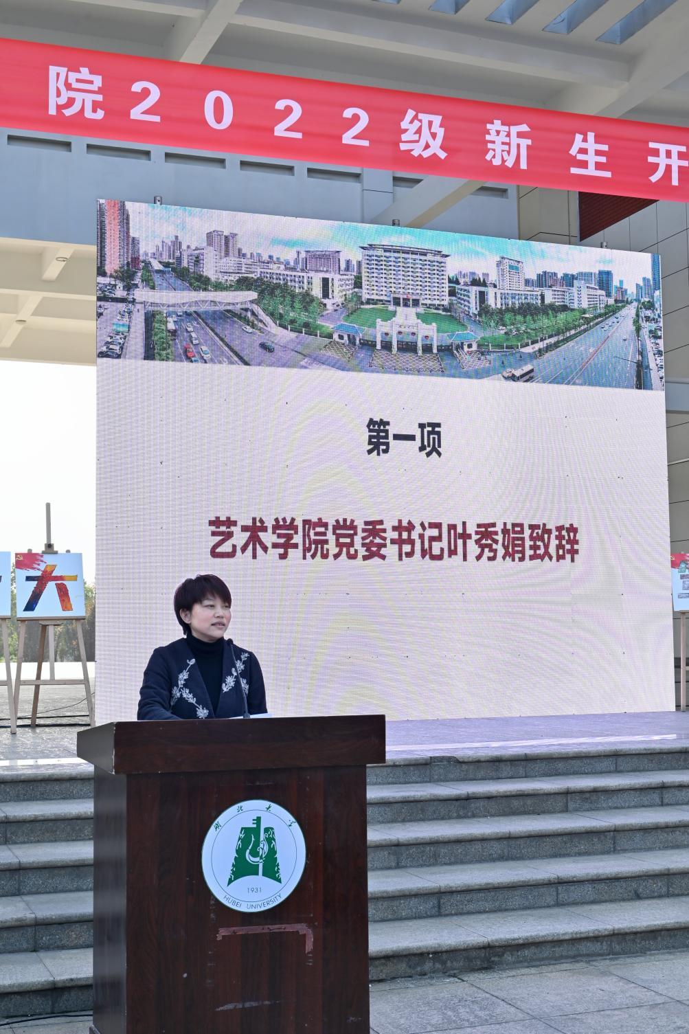 艺术公司党委书记叶秀娟首先致辞。她向2022级本科新生表示了热烈欢迎和美好祝福,从领航、起航、导航、护航教育四个方面对2022级新生入学教育活动方案进行了解读,并给同学们送上三点寄语:一是坚持理想融入时代,铸魂塑形;二是坚持理论统一实践,沉稳致远;三是坚持奋斗携手友谊,一路同行,希望同学们谨记习近平总书记对青年的嘱托,在求学之路奋发向上,做出自己的好成绩。