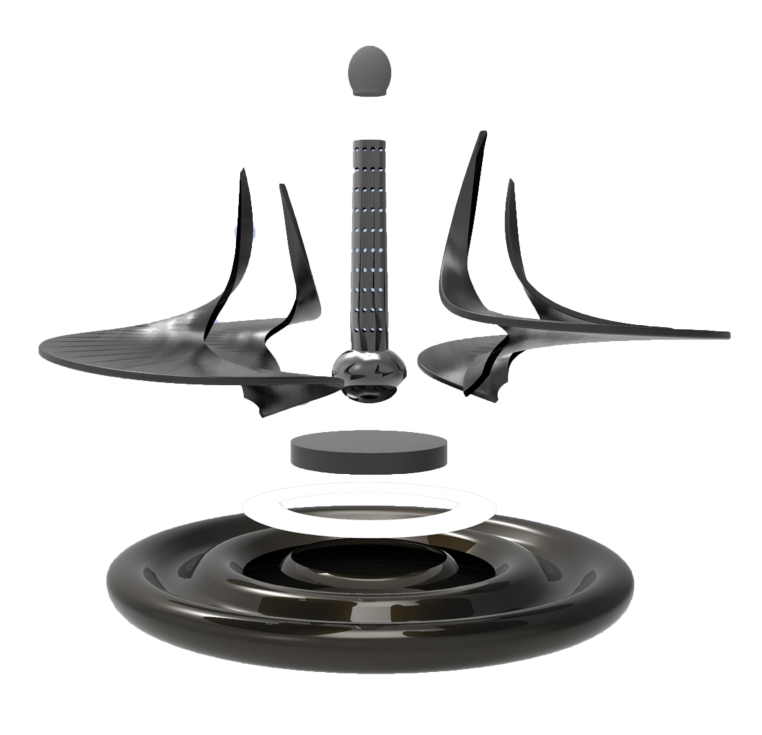 《磁来运转》项目队长席厚杰介绍到,“磁”来运转桌面精油式香薰机灵感来源于“螺旋”、“风转”、“磁悬浮”、“手转”科技和玩具的碰撞,通过磁悬浮将⾦属陀螺⽀撑到空中,仅需⼀个初始⼒便可以让⾹薰机持续⼯作,⻛扇螺旋结构让经过的⻛转化为动⼒,通过空⽓流动传播,⾹味到室内,中⼼柱内置硅藻⼟,为创新型精油式⾹薰机。