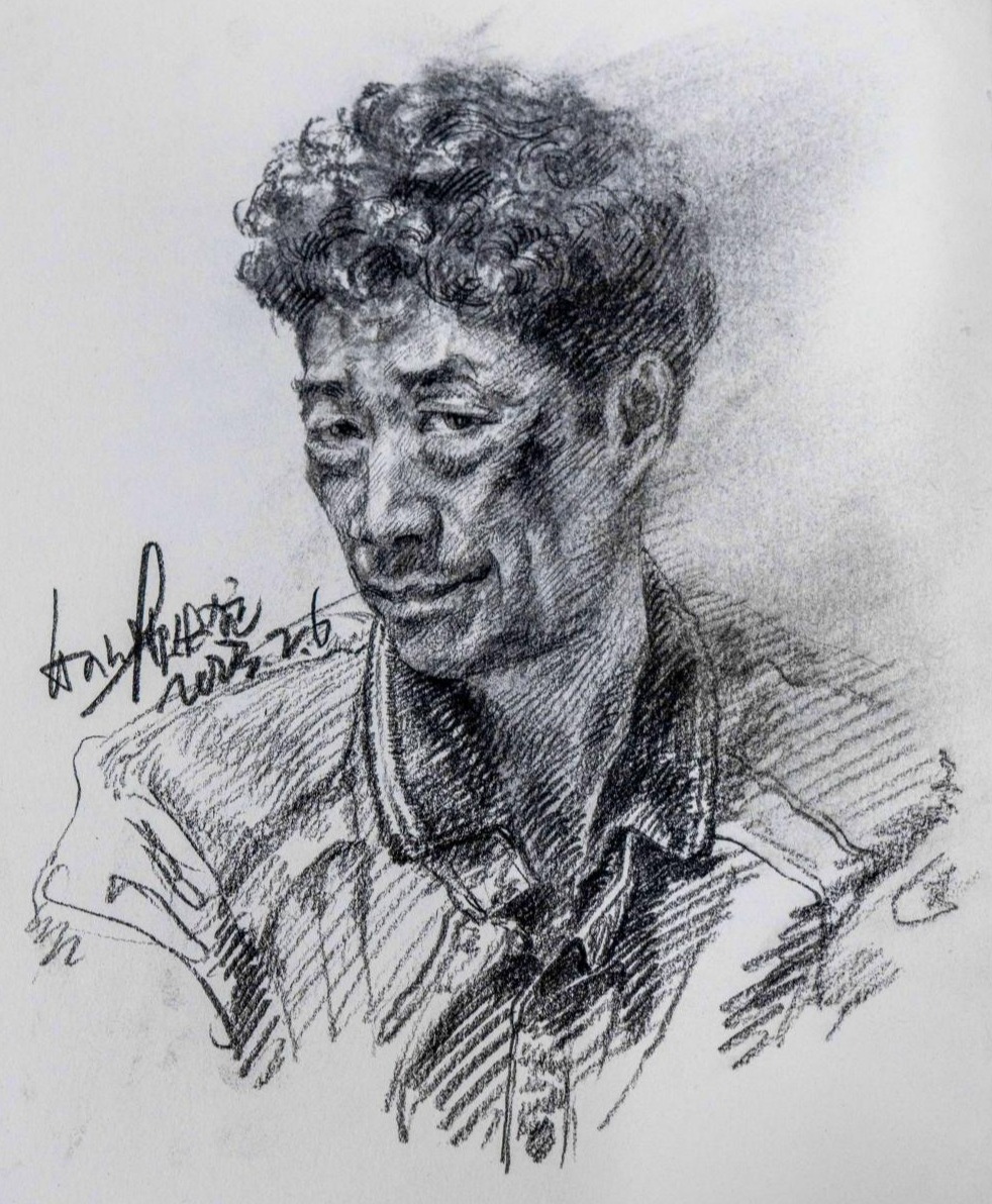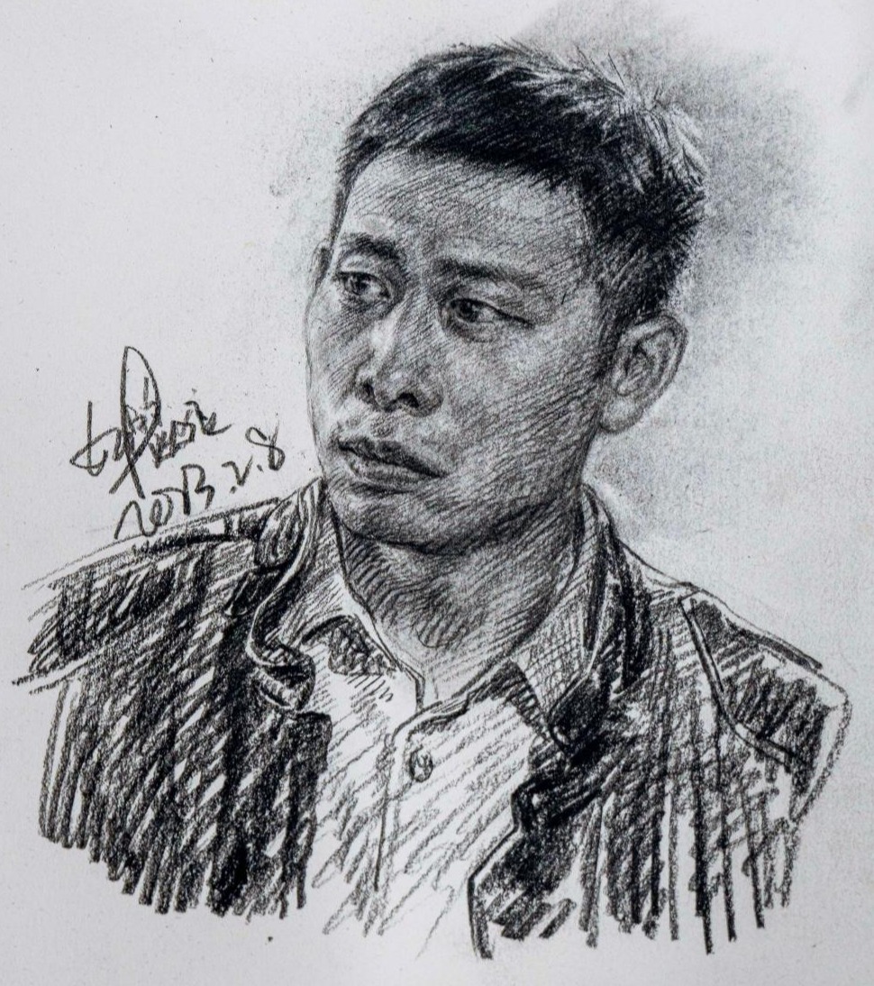 王宇飞介绍,就人物速写来说,四分之三侧脸是比较容易的,而正脸相对技巧性更强。他特地为人物“徐江”画了一个正脸,“这个角色个性鲜明,眉眼嘴唇都是戏,正面画能保留更多表情细节”。
