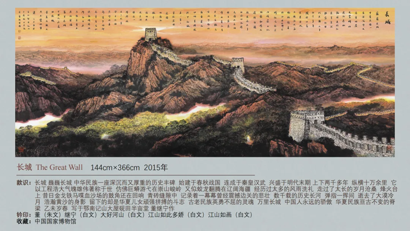 董继宁教授是当代山水画艺术的集大成者,在根植传统的同时,注重写生。中国山水画的诗意化追求溶入他对大山大水、真山真水的精神关怀,以诗意化的构图及充满激情的色彩,表述着对民族精神的颂扬和对天地生命的礼赞。他的作品既精微又宏大,充满了艺术美感与勃勃生机,彰显了艺术来源于生活的创作追求和鲜明独特的个人风貌,在中国山水画坛树立了全新的学术标杆,独领风骚,引人瞩目。