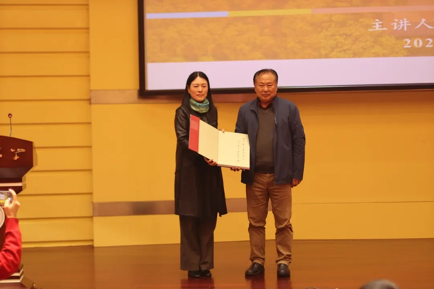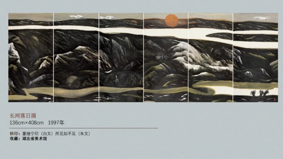 讲座开讲前,师生们通过《大写湖北人》专题片,了解了董教授自十八岁学画起勤恳努力、笔耕不辍,立志“为祖国山河立传”。历经数十载,董继宁教授始终不忘初心,心系天下,情系故土,积毕生心力建设董继宁美术馆,并无偿捐献给当地政府,让更多老百姓接触艺术、欣赏艺术、享受艺术。讲座开篇,展示了董继宁教授荣获画坛最高荣誉之称的“国际艺苑水墨画五年成就大奖”的经典名作《长河落日圆》。