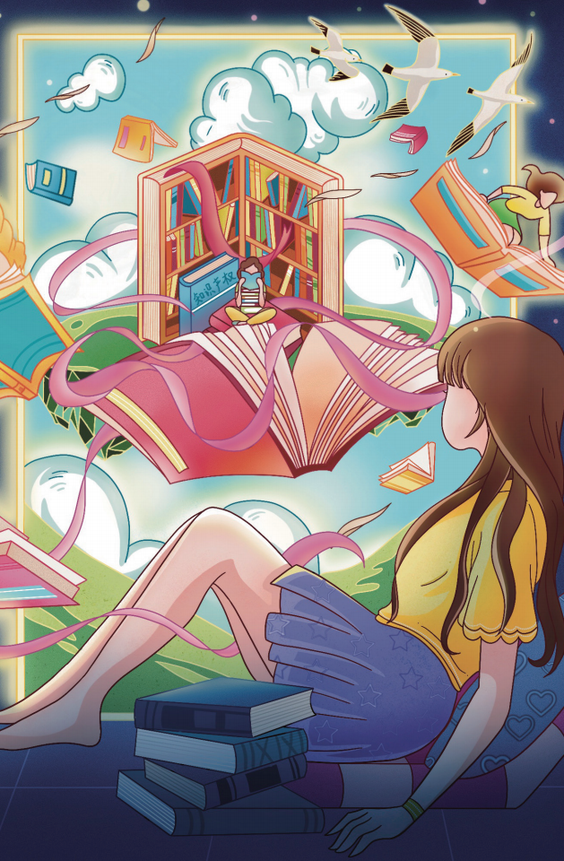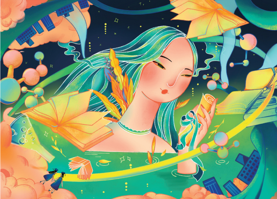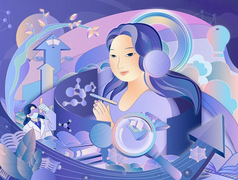 本期封面插画的设计主题是“女性与知识产权”。整个画面充满科技与神秘感,以知识女性为核心元素,书本、分子结构等作为具有文化符号象征的辅助元素。画面人物洒脱自由、个性张扬,插画构图中文化符号与叙事情境交融,空间结构深邃而转换多样、层次分明,在同类色搭配高度统一的节奏中增添了知识无限的神秘色彩感,为今年世界知识产权日的主题营造了富有丰富遐想空间的文化氛围。