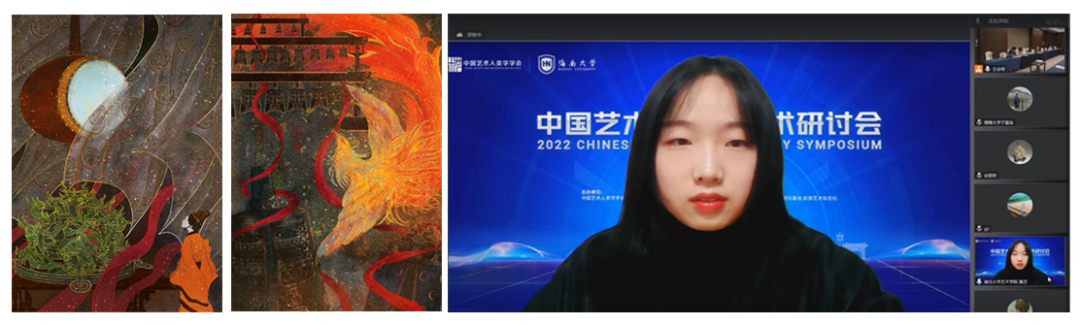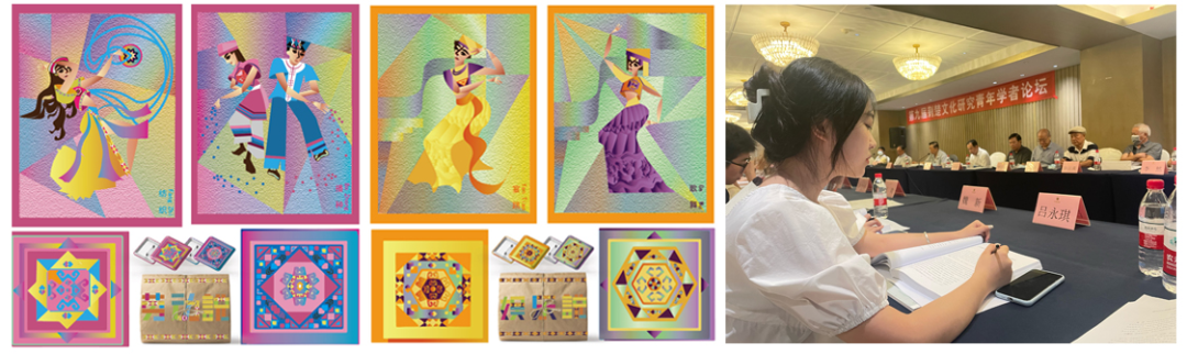比如,2022年11月,硕士研究生黄艺参加中国艺术人类学国际学术研讨会,并结合自己的论文与创作《融合曾侯乙乐器文化的岩彩数字插画设计研究》发表主旨演讲;2020年,硕士研究生王敏分别参加二十四节气国际学术研讨会与中国民俗学会年会,并结合论文与创作《基于二十四节气与地域文化符号的叙事性产品视觉设计研究》做主旨发言;2022年9月,硕士研究生吕永琪参加湖北省第九届荆楚文化研究青年学者论坛,并结合论文与创作《设计符号学视域下恩施土家族摆手舞起源说的视觉图式化探索》做主旨发言;2021年11月,硕士研究生万晴晴参加“荆楚文化与乡村振兴”学术研讨会,并结合论文与创作《楚漆耳杯的形态艺术与“萌”趣化表情包视觉形象设计介入》做主旨发言。