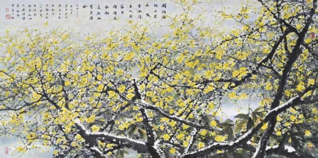 款识:腊梅满枝立寒冬 傲雪冰清自从容 家父种得庭前树 长与桃李笑春风 公元二0二0元月农历辛丑除夕之夜 为纪念父亲去逝二十周年而作于鄂南记山大屋耕读园 继宁灯下并识