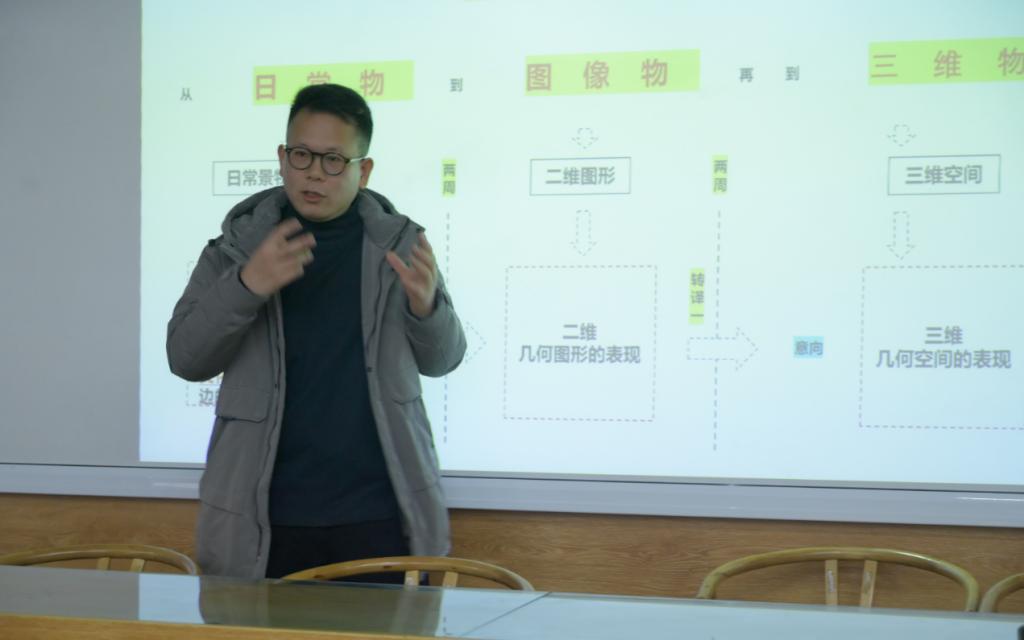 《设计基础1》课程负责人李晶涛副教授从课程目标重构、课程实践创新方向等方面展示了教学创新成效。