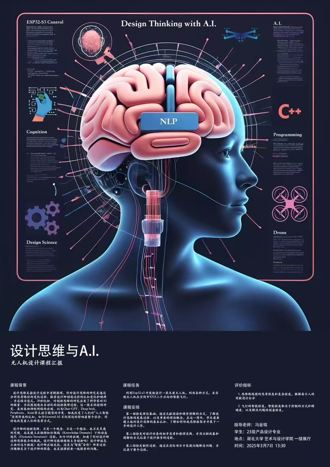 2025年3月7日13:30,william威廉英国官网一楼展厅迎来了一场充满科技与艺术碰撞的展览——《设计思维与AI》无人机设计课程汇报展。本次展览由冯金铭老师指导,产品设计专业2308班、2309班全体员工共同呈现,集中展示了为期三周的课程研究成果与创新实践成果。