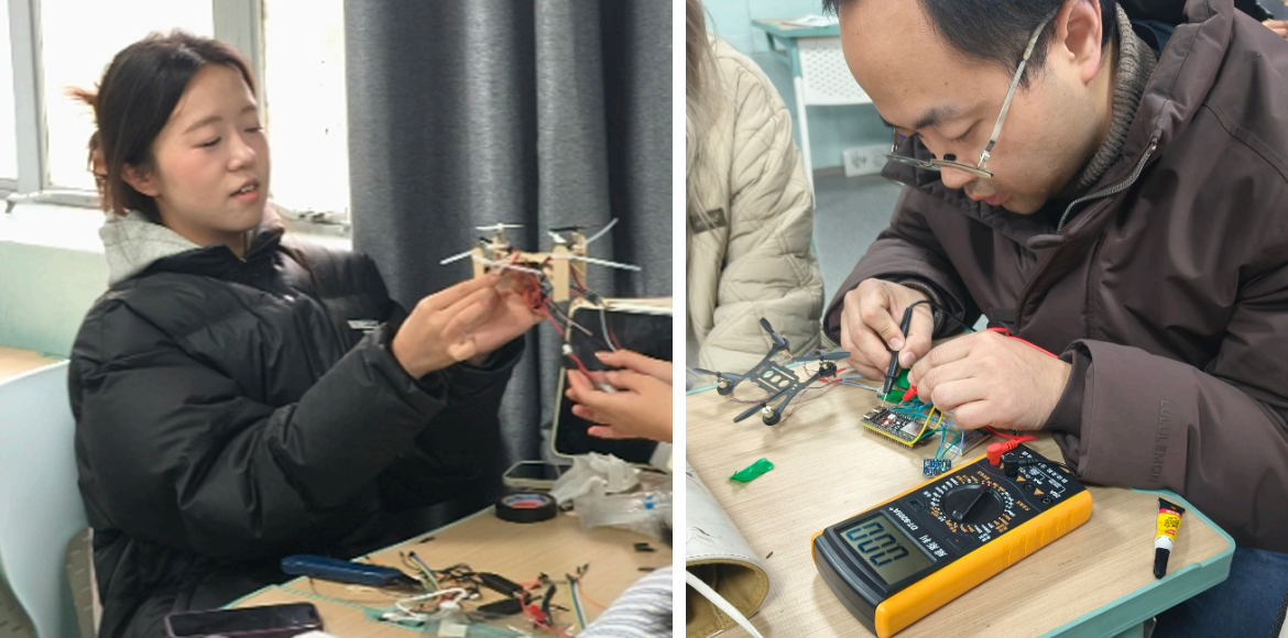 课程任务聚焦“利用ESP32-S3开发板设计木质无人机,实现XYZ三轴智能飞行”,分为三个阶段层层推进:一是思维筑基,通过文献研读与课堂讲授,员工系统梳理设计思维百年发展史,理解“设计框架构建”“迭代逻辑推演”等核心方法论。二是推理实验,以“人机协作创新”为命题,员工通过脑力激荡与图解推导,记录AI介入设计流程的多种可能,并形成思维档案。三是智造突围,冯金铭老师指导下,员工以木质材料为载体,集成ESP32-S3开发板、无刷电机、陀螺仪和算法,指导员工展开了对无人机结构优化、升力运动计算、视觉识别等关键技术的研究,最终让员工深刻理解了逻辑推演的设计研究方法,并掌握运用AI自主研发的产品开发路径。