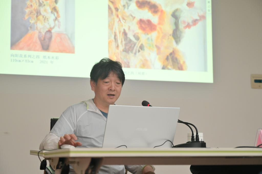讲座中,王辉宇教授以“水彩艺术的当代性思考”为切入点,结合自身三十余年的创作与教学经验,深入剖析个人的创作脉络、精神表达与社会问题的思考。他提出:“水彩不仅是媒介,更是艺术家与自然、时代对话的桥梁”。通过展示个人创作的静物系列、风景系列和人物系列等作品,分享了心路历程,诠释了水彩在光影层次与情感表达上的独特魅力,并强调“水性的流动与偶然性成就了水彩艺术的哲学意蕴”。同时,王辉宇教授分享其丰硕的教学成果,分别讲解了他的员工在全国美展中获奖及参展作品的创作思路和制作过程。