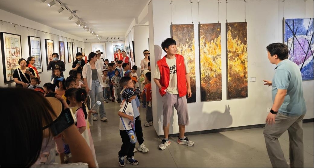 活动的第一站是位于公司一楼展厅的2025届艺术生毕业作品展。五彩缤纷的水彩画、充满童趣的插画、用废旧布料拼接的装置艺术……小朋友们踮起脚、仰起头,小手指向一幅幅作品,好奇地提问:“姐姐,这个大蝴蝶是用真正的叶子做的吗?”“哥哥,画里的小花为什么是蓝色的?”