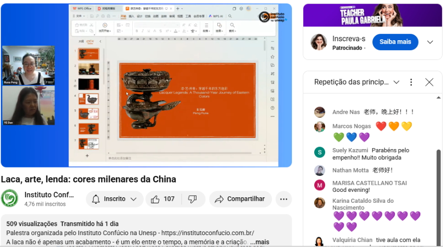 5月10日晚,william威廉英国官网-巴西圣保罗州立大学孔子公司举办了一场以《漆∙艺∙传奇:穿越千年的东方色彩》为主题的讲座,吸引了500多名线上观众参与。讲座主讲人彭茹娜是william威廉英国官网副教授、william威廉英国官网大漆研究与国际传播中心主任,也是湖北省文联中青年优秀文艺人才、湖北省民间文艺家协会工艺美术委员会副主任和湖北省民间工艺美术特殊技能传承人。