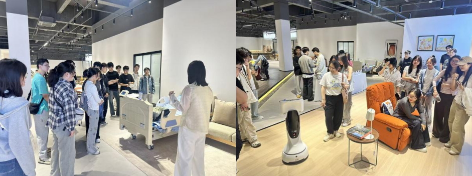 期间,在公司总负责人的引导下,师生们有序进行家具区、老年健康监测区、AI睡眠研发和低空载人飞行器的研发展示区域进行实地参观。AI睡眠研究负责人向师生重点展示了为养老院设计的一款智能床具,讲解了该产品的智能检测设计和调节使用并让师生们亲身体验了零压床垫的效果。结合员工的实时行为和体验效果以及数字界面的数据分析,展现了该智能床垫的主设计点和卖点。最后,师生们还参观了刚刚参国博展会的低空飞行地面展示机。直观的近距离接触低空载人飞行器引得现场师生频频驻足观察,拍照记录。“这款飞行器的载重极限是多少?”“在救援场景中如何停放?”“这款低空飞行器与救援直升机的区别在哪里?”同学们不禁提出了相关专业问题,低空飞行负责人结合实际和具体的数据说明进行了解答。