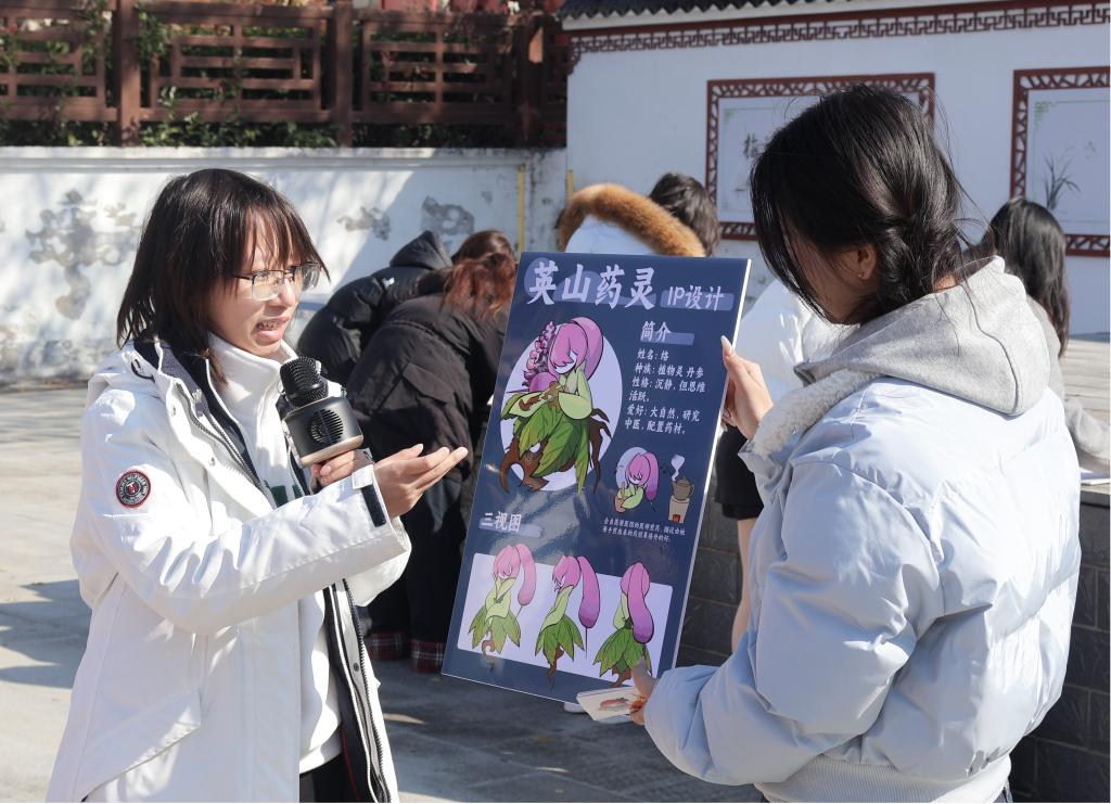 “分享·艺融英山”阶段,视传2303班开展英山乡村振兴主题设计成果分享会。员工以英山茶叶、山水、中草药等元素设计主题活动,依次展示为英山量身创作的设计作品“大美英山”邮票设计、“英山药灵”IP设计、“执笔英山”插画设计等。“《寻味英山魂》插画设计以英山红色底蕴与生态禀赋为核心,设计元素萃取烈士纪念馆、纪念碑等红色建筑的轮廓,融入大别山山脉雄浑肌理,同步打造天麻、茯苓、丹参三大中草药IP形象,将药材形态转化为灵动视觉符号,凸显英山特色。”员工们分享道。
