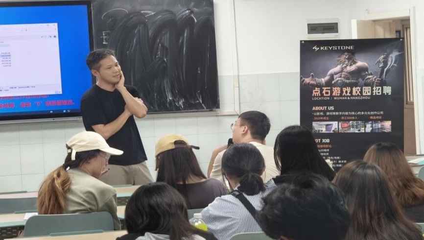 点石数码设计有限公司美术总监胡江涛和HR胡海浪在宣讲中详尽阐述了公司的独特文化内核、坚实的技术底蕴、近期引人注目的热门项目案例以及前瞻性的未来发展规划。通过系统化的介绍,展现了公司在行业内的稳健步伐与创新活力,深刻剖析了各招聘岗位的具体职责、严格的任职要求以及清晰明确的职业发展路径,为求职者勾勒出一幅既充满挑战又前景广阔的职业蓝图。在宣讲过程中,同学们全神贯注,不时记录重要信息。当讲到职业规划部分时,许多同学纷纷举手提问,就游戏行业的发展趋势、个人在公司的成长空间等问题与宣讲人进行深入交流。