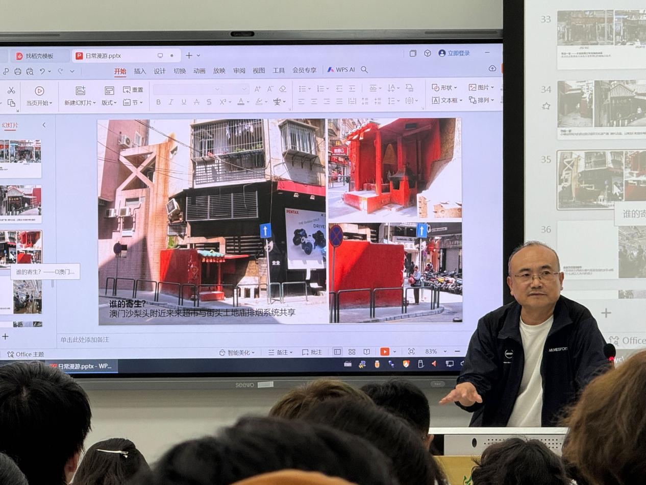 接着龙元教授围绕城市生活景观展开讲解。以日本著名专家“今和次郎”独创的“考现学”为例向同学们介绍其对社会风景的意义,并通过展示海量实例,图文并茂地向大家展现了各种各样生活风景,龙元教授表示”绿色设计”、“负面变资源设计”等,最终都要与人合在一起,建筑要与人和平相处。“从物质到非物质关注的是人本身,人是大家需要关注的重要方面。”龙元教授如是说。
