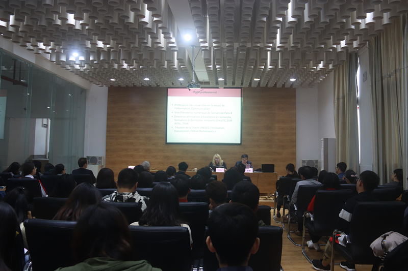 在“新学习方式与装备:发明、传播与创新”学术讲座上,AZEMARD Ghislaine教授从联合国教科文组织的理论高度,以立足欧盟的宏观战略视角,从法国数字媒体领域的教育、产业和政策的整体发展出发,向艺术公司师生详细讲解了法国政府最近几年对其大学教育的最新发展情况。阿则玛赫教授讲解了大学教育、科研如何与企业发展紧密结合,以促进国家和地方经济的可持续发展,提高高校就业率。她详细介绍了在其领导下的联合国教科文组织数字传播教席团队、巴黎第八大学、法国IDEFI计划(3亿民币项目)、雷顿实验室如何在科研、教学和实践等方面构成的互补体系以及如何在跨学科、发明创新、国际观察三个维度开展具体工作等情况。讲座结束后,阿则玛赫教授和艺术公司师生交流了AR、VR和MR等信息技术在历史文化遗产领域的最新发展和应用,艺术公司外籍教授David详细询问了联合国教科文组织怎样从理论研究维度和巴黎第八大学的教学工作展开互动等问题。