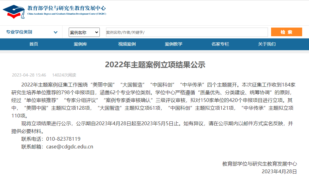 中国专业学位教学案例,是由国务院学位委员会办公室指导、教育部学位与研究生教育发展中心牵头建设。是我国专业类别最全、案例数量最多、特色明显、获得广泛认可的国家级案例中心。