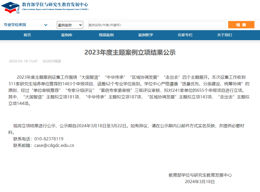 2024年3月23日,教育部学位与研究生教育发展中心发布了“中国专业学位案例中心”2023年主题案例立项结果,公司刘卷教授主持的《数智赋能中国文化叙事——基于盘龙城国家考古遗址公园文化的数字衍生品设计创新与“活态化”传播》案例成功获批立项。