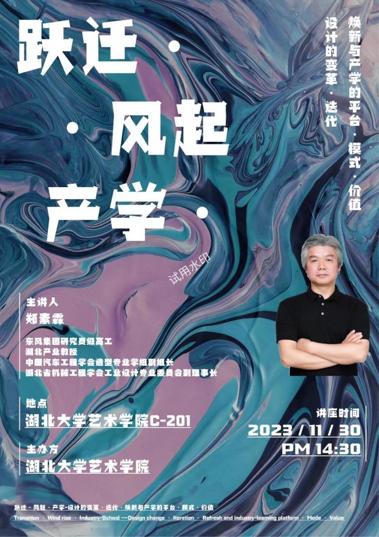 11月30日下午,“跃迁·风起·产学”主题讲座在公司二楼报告厅举行,本次讲座由东风集团造型设计首席总工程师、湖北省产业教授、中国汽车工程学会造型学组副组长、湖北省机械工程学会工业设计专业委员会副理事长郑素霖教授主讲,郑教授也是中国首批资深设计师,中国汽车造型设计大赛组委会评审专家。
