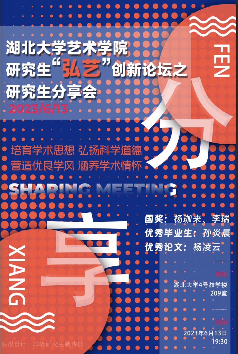 为培育学术思想,弘扬科学道德,营造优良学风,涵养学术情怀,公司开办研究生“弘艺”创新论坛系列活动。6月13日,第一期研究生“弘艺”创新论坛之“优秀研究生分享会”第一期活动在4号教学楼201教室顺利举办。本期活动在线上和线下同步进行,国家奖学金获得者、2020级美术学专业杨珈来,2020级数字媒体艺术专业李瑞同学,优秀毕业生2020级环境设计专业孙炎晨,优秀论文获得者、2020级视觉传达设计专业杨凌云同学等四位优秀研究生代表参加会议,分享了各自的学习心得和宝贵经验。