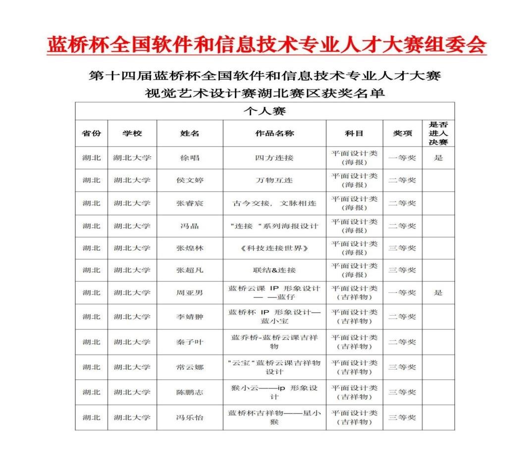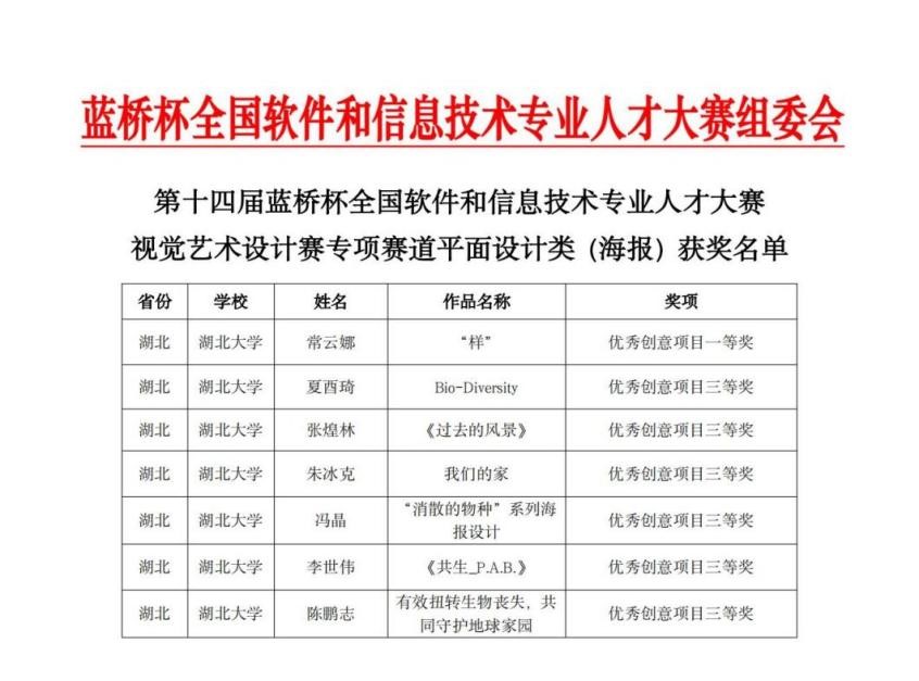 近日,第十四届蓝桥杯全国软件和信息技术专业人才大赛视觉艺术设计赛结果揭晓,公司员工获得专项赛道平面设计类全国优秀创意项目一等奖1项、三等奖6项;个人正式赛道获得湖北省赛区一等奖2项、二等奖5项、三等奖5项;团队赛获得湖北省赛区二等奖4项、三等奖1项。