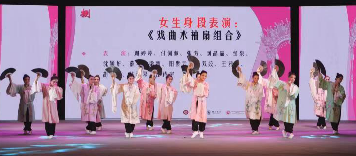 扇子在中国已有三四千年的历史,其形态各异,种类繁多,既有生活实用价值又有艺术观赏价值。14位女学员在将扇子舞与戏曲特有的水袖相结合,融入“手眼身法步”,配以优美婉转的乐曲,演绎了一段精彩绝伦的扇子水袖舞。