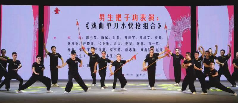 汇报演出在庄严威武的男生把子功表演中拉开序幕。只见台上花枪飞舞,令人眼花缭乱,全体男学员以及两位女小生的精彩表演赢来了台下一片片叫好声。