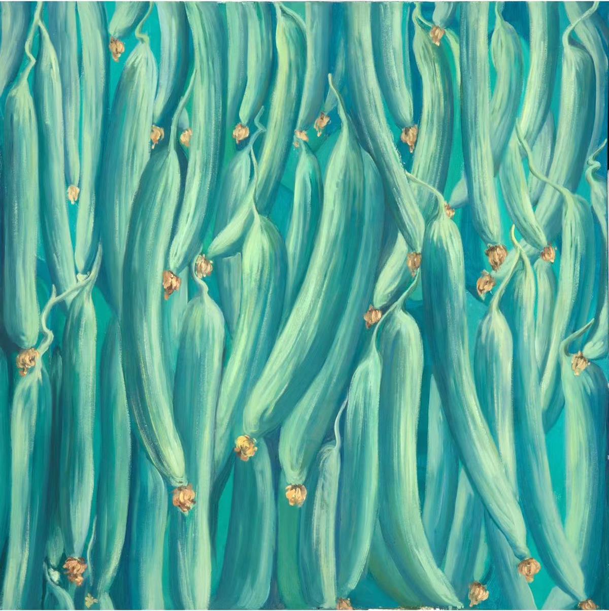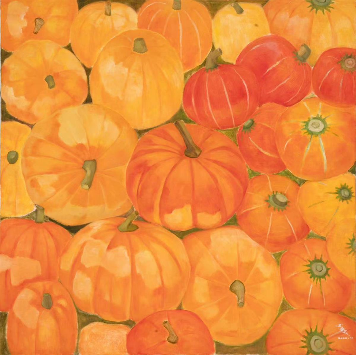 李碧红将五颜六色的它们一一呈现在画布上。《丰硕》由9幅油画组成,每一幅描绘一种蔬菜,红色的辣椒、橙色的南瓜、黄色的玉米、绿色的白菜、青色的丝瓜、蓝色的甘蓝、紫色的茄子、黑色的菱角、白色的萝卜。《橙与蓝》则为橘与蓝莓,《黄与绿》为梨与苹果,等等。“每张面孔都是那么的熟悉,味道也是那么的熟悉。”