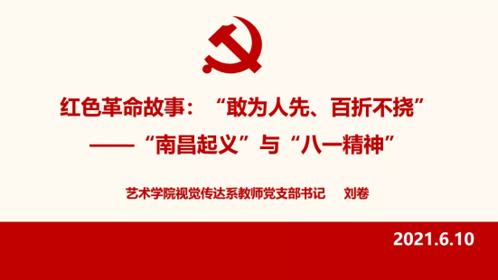 支部书记刘卷老师讲题为《红色革命故事:“敢为人先、百折不挠”——“南昌起义”与“八一精神”》党课。刘卷书记以一幅油画、一幢旧址、一封书笺、一盏马灯、一条红领带、一份刊物为主线讲述“南昌起义”的过程,诠释筚路蓝缕的革命之路,“南昌起义”承载着坚定不移的革命信念,及其彰显着代代相传的初心使命。并强调“南昌起义”与“八一精神”的永恒价值,及革命先驱敢为人先、百折不挠,勇于探索、拼搏的精神。勉励党员们通过学习一个个鲜活的革命故事,牢记党的信念,深谙学习党史的重要意义,在今后的工作学习中勇于克服困难,不畏艰险,将红色革命精神发扬光大。