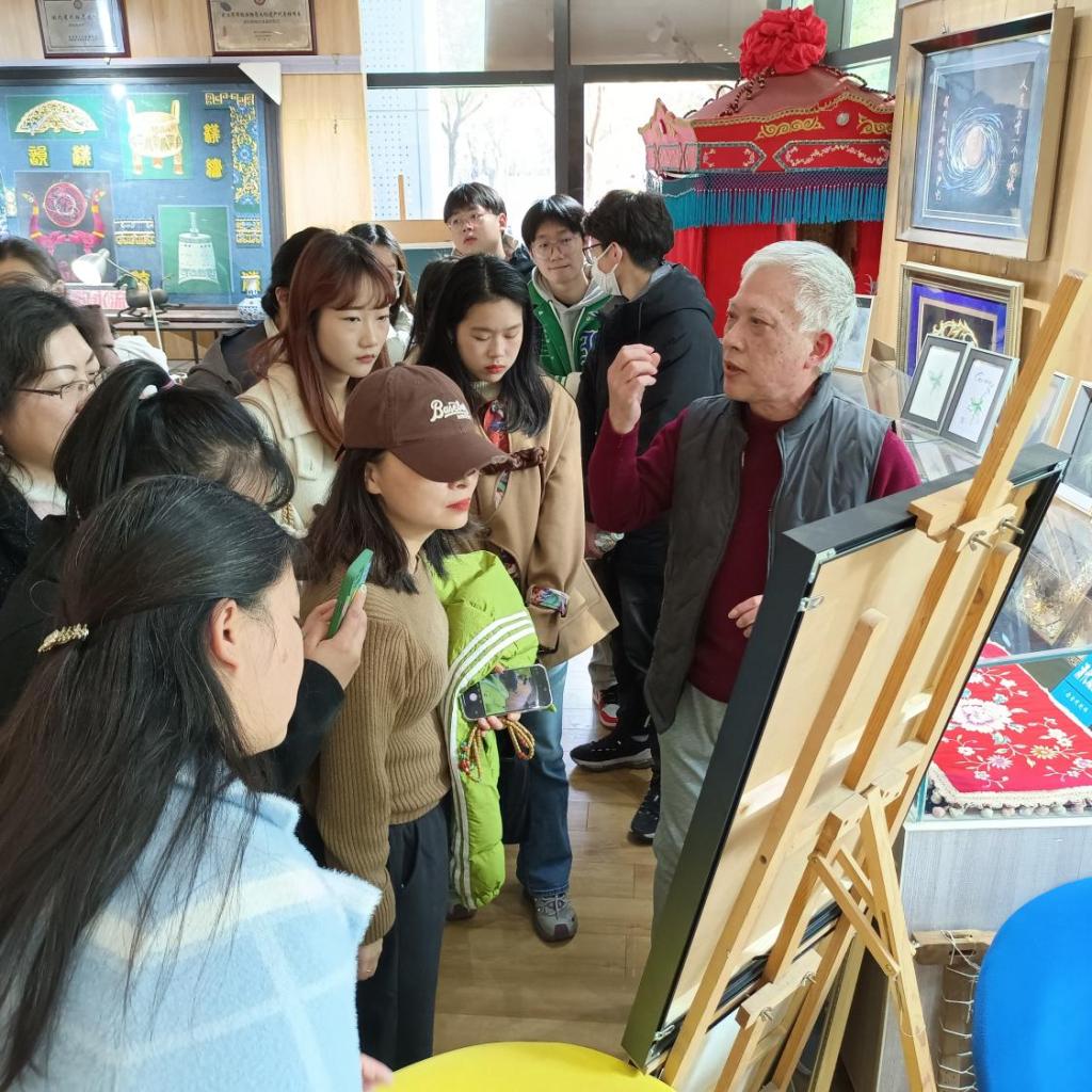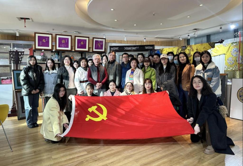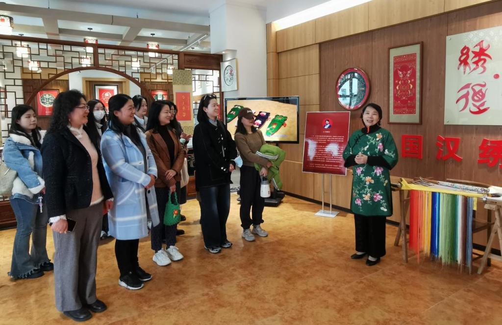 在交流环节,支部师生针对汉绣艺术的制作手法、图案设计和色彩变幻等进行咨询,汉绣工作室专家们对师生疑问逐一进行了解答。党支部书记刘卷向汉绣工作室的专家们介绍了近些年来支部师生们致力于继承优秀传统文化,充分发挥学科特色,在学术研究和创新性学科竞赛中取得的多项成果,并围绕如何更好践行“着力赓续中华文脉、推动中华优秀传统文化创造性转化和创新性发展”的使命与汉绣工作室专家们进行了经验交流。活动中支部师生充分感受到汉绣文化的魅力,体会了前辈艺术家们对优秀传统文化继承发扬过程中的艰辛与不易,坚定了深入钻研学科知识,来更好地传播中华文化、讲好中国故事的决心。