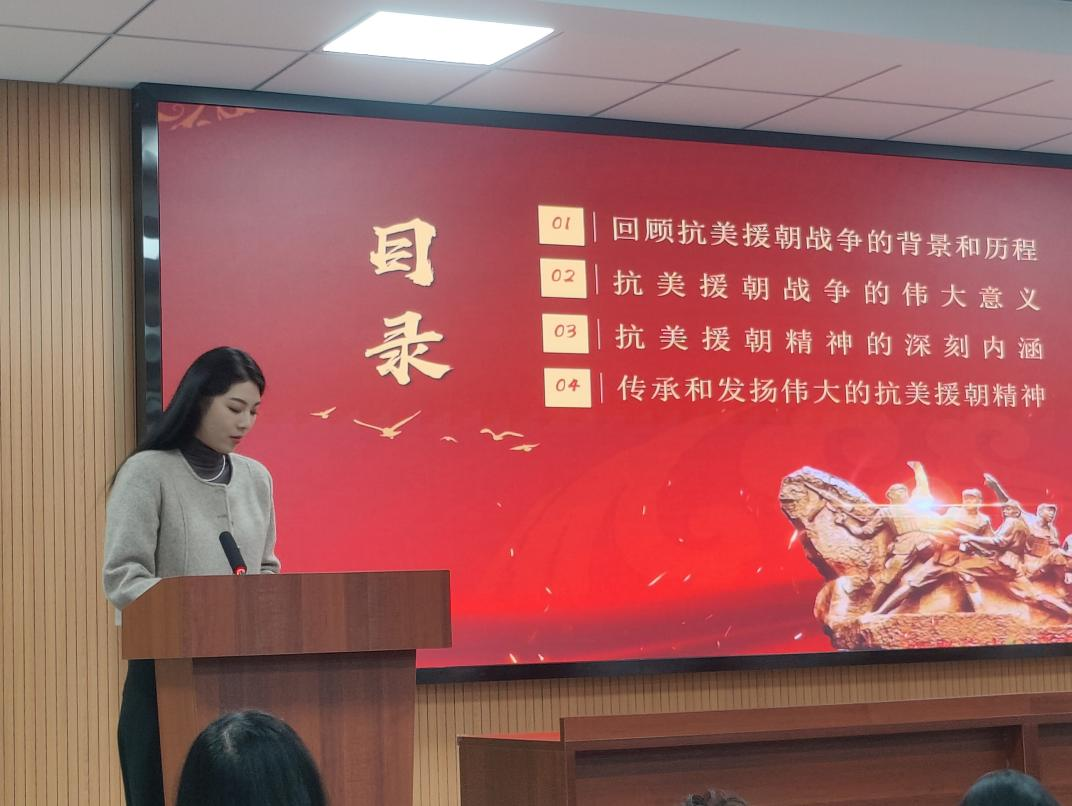 万奕、杨琼玮等选手分别从时代背景、形成过程、丰富内涵、当代启示等方面学习分享了延安精神、西柏坡精神、抗美援朝精神、三牛精神等十几项伟大精神。其中余茵同学以抗美援朝战争为切入点,按照时间顺序重点介绍了朝鲜战争爆发、中国派兵入朝、抗美援朝几次重大战役、中国人民志愿军取得胜利、休战和谈等战争历程,深入探寻了抗美援朝战争形成的全景过程以及抗美援朝精神的深刻内涵。她表示,通过对抗美援朝精神的学习和了解,从中汲取了力量和方向,明确了自身定位,提升了自身政治修养和政治素质。