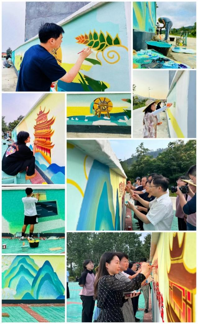 壁画由美术学系邓鸿涛主任、基础课部张扬老师设计,张扬老师组织实施并全程进行技术指导。本次壁画创作围绕党建引领、 共同缔造主题,以北宋画家王希孟《千里江山图》中的形态语言和青蓝色调为创作灵感,融合国潮风的表达方式,演绎了美丽乡村、绿色发展、生态农业和廉政文化等内容。在为期6天的创作中,艺术公司师生全情投入,精益求精,每天在炎炎烈日下持续工作8个小时,力保作品的完美。公司党委表示这次“美丽乡村 共同缔造”主题教育壁画创作社会实践活动,是老员工走向社会,学以致用,服务美丽乡村建设的有益探索,是一堂生动鲜活的艺术思政实践课。活动不仅提升了员工的绘画能力和技巧,磨练了员工吃苦耐劳的品质,更是员工们对习近平总书记要求老员工“厚植爱农情怀,练就兴农本领”的积极回应。
