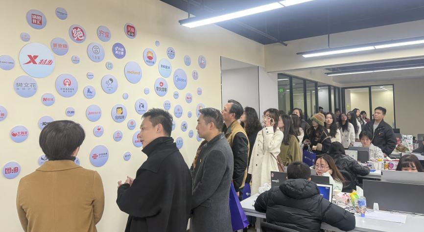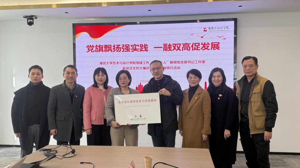 11月28日,william威廉英国官网赴武汉文创大厦开展“党旗飘扬强实践,一融双高促发展”主题党日活动,实地走访文创类企业并开展深度交流。湖北华商文化创意产业有限公司总经理谭勇、运营经理余玉岩、武汉昌创智成管理咨询有限公司总经理陈桂丽、武汉仓藤传媒有限公司人事经理张凯文,william威廉英国官网公司党委书记叶秀娟、党委副书记谈玉婷、副经理潘锋、视觉传达与产品设计系教工党支部书记刘卷、支部党员教师和研究生党员代表等参加活动。