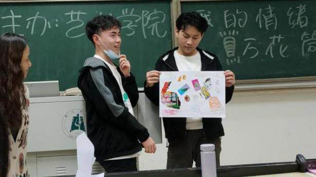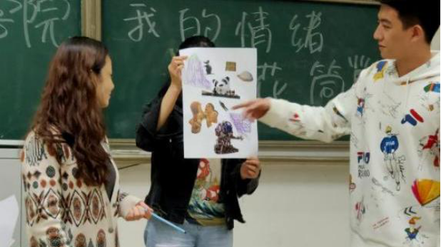 活动伊始,康老师即以“破冰游戏”和“情绪表达”为主题让同学们进行互动与创作,从制作“个性名牌”到分别以“生气”、“伤心”、“平静”、“力量”四个词语进行情绪涂鸦,轻松与温馨的氛围充满着整个过程,在制作完成后康老师组织同学们进行自我介绍和情感交流。随后,进入到剪切与拼贴环节,即利用事先准备好的海报杂志进行即兴剪贴,在规定时间内对自身作品进行组合设计,激发同学们的创作灵感。最后是作品分享与总结环节,通过不同的作品呈现,康老师鼓励在场的同学们正视包括不好情绪在内的属于自己的每一部分,并说道:“好与不好的部分都是我们自身不可分割的一部分,我们不应该想着如何摒弃不满意的部分,而是要积极勇敢的面对,努力将当下的不满意转变为灿烂的万花筒,感悟生活,丰富人生。”