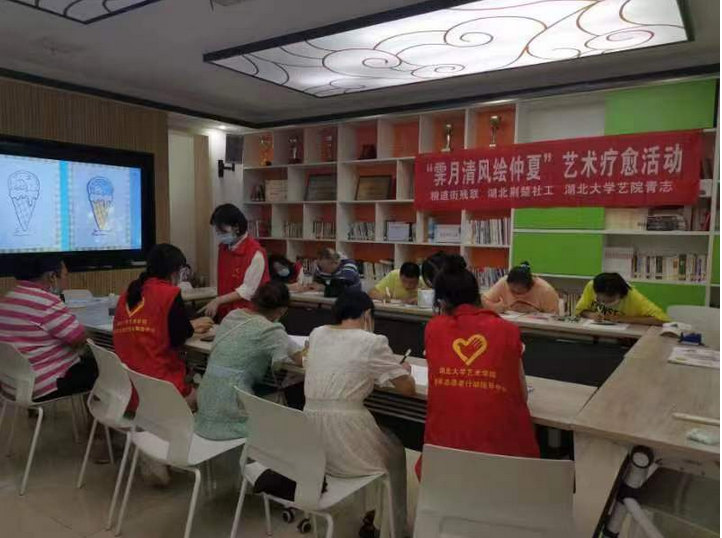 当天活动的主题是“霁月清风绘仲夏”。志愿者们首先通过“色彩情感”小活动进行暖场。接着,志愿者们带领“阳光学员”将他们对夏日的感受用色彩表达出来,而不强调绘画技术,这种通过艺术的创造性过程有利于改善参与者的生理、心理状态。在学员们的笔下,冰淇淋小兔子、清爽西瓜等跃然纸上。随后,志愿者们将学员们今年上半年创作的画作进行展示。面对自己创作的一幅幅作品,有些学员还有些害羞,多数学员还是主动地表达感情。由于武汉夏季炎热,志愿者们还细致耐心地给学员们介绍了一些防暑降温的知识。活动最后,湖大艺术公司团委书记许诩给学员们送上了自己创作的书法作品,祝福每一位学员暑期健康快乐。