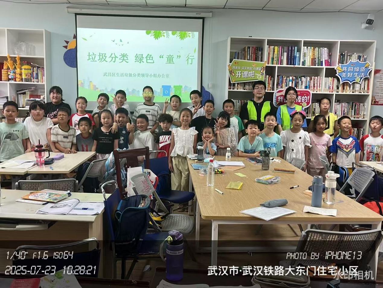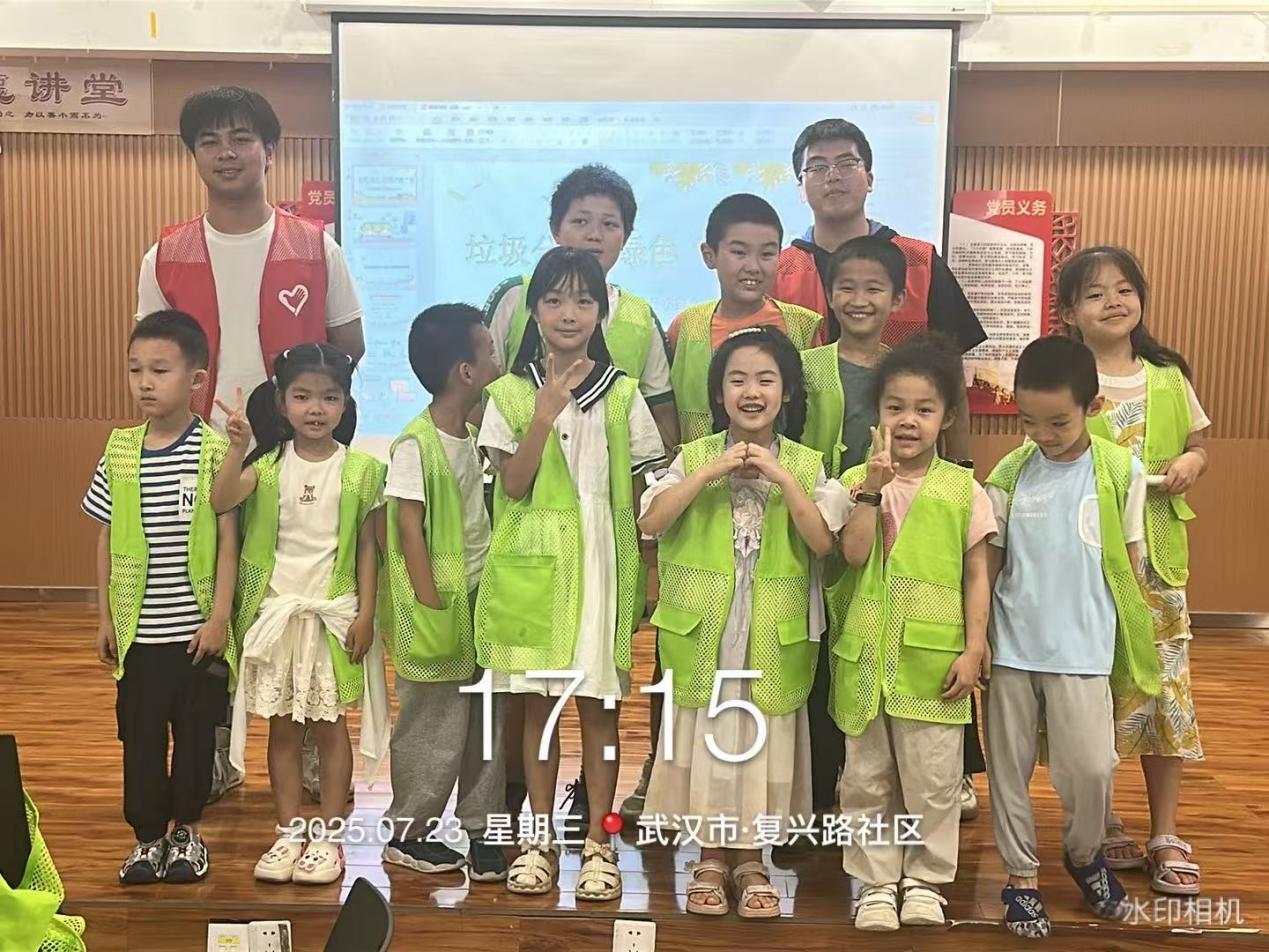 从铁路大东门渴求知识的身影,到复兴路社区欢快的互动笑声,志愿者们红、绿马甲交替闪现的身影,成为托管班最灵动的风景。武汉铁路大东门的合影中,孩子们簇拥着志愿者,比出鲜活的“绿叶”手势;复兴路社区的课后,桌面上残留的分类草稿纸,无声印证着知识的消化。