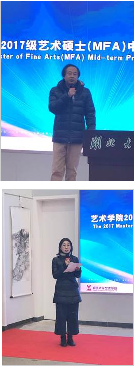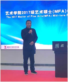 开幕式结束后,2017级艺术硕士按照美术、艺术设计两个专业领域举行了开题报告会。董继宁教授、许开强教授分别担任开题委员会主席。专家们进一步针对同学们的选题和创作设计中的问题,做了详细的点评和指导。