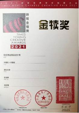 11月6日,第三十届时报金犊奖全球总决赛落下帷幕,公司艺术公司传承与创新团队工作室员工许洁婷同学设计作品《中国旺×中国结》荣获旺旺周边商品设计奖全球金犊奖,田志梅老师获得2021时报金犊奖优秀指导教师奖。